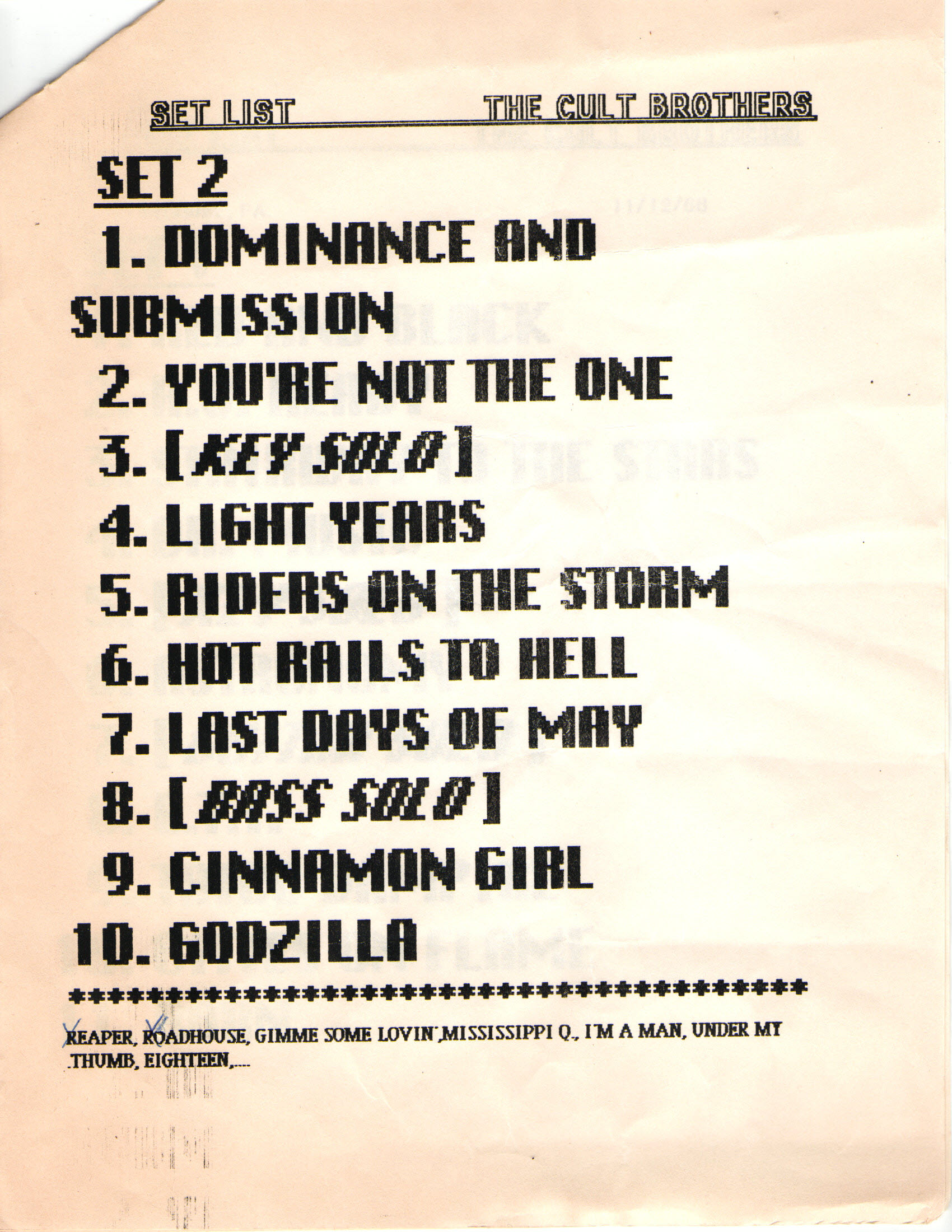Cult Brothers’ Setlists — 23 East Cabaret, Ardmore, PA (November 12, 1988)