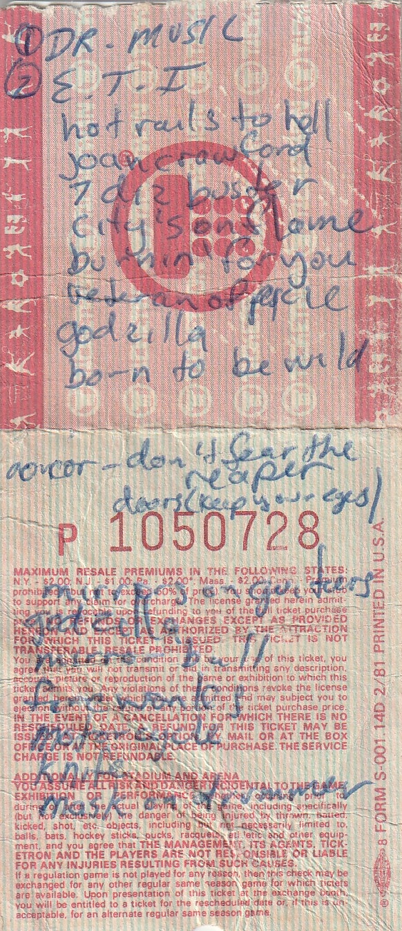 Cameras weren’t allowed, but I managed to sneak in a little pocket Kodak and rig it so I could hold the shutter open longer, since I couldn’t use a flash. There is also a scan of the back of my ticket with my original hand written notes.