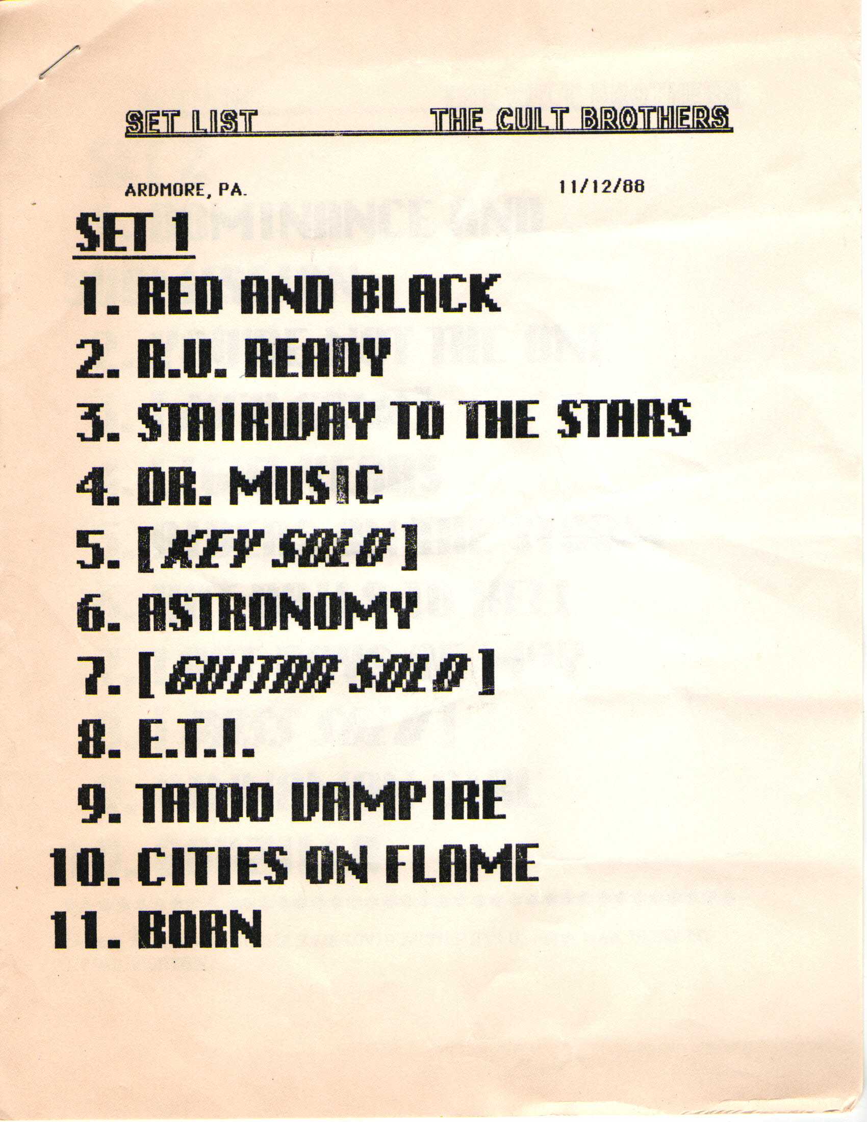 Cult Brothers’ Setlists — 23 East Cabaret, Ardmore, PA (November 12, 1988)