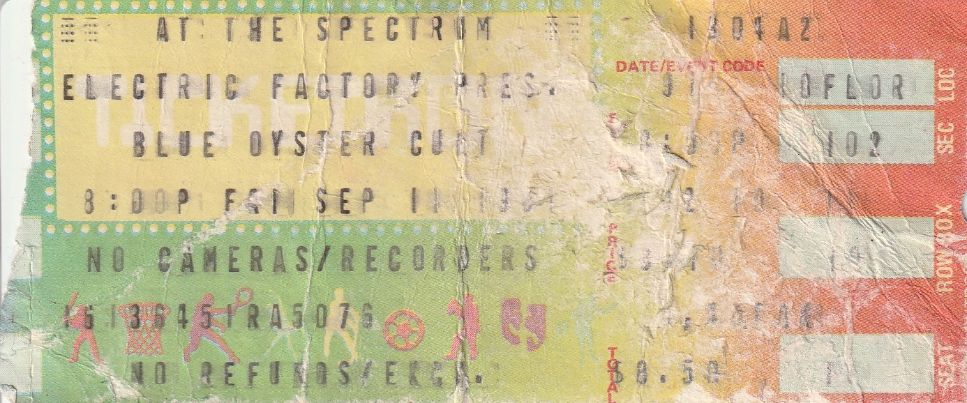 By then, the crowd was completely amped for BÖC. The entire floor section was standing on their seats, chanting for them to come out. We were holding our banner so high we couldn’t see a thing. When the spotlights hit us, my brother instinctively bit a hole in the sheet—never letting go of his edge—so my girlfriend could stick her head through. The whole Spectrum went wild.