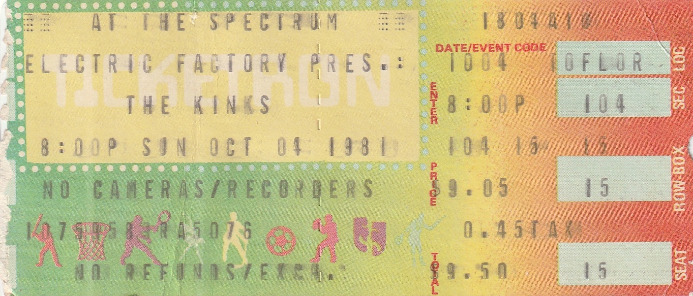 Kinks ticket for Sunday, October 4, 1981 at the Spectrum.