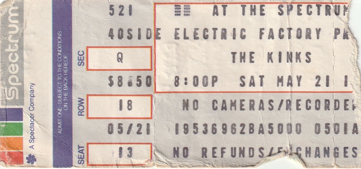 The Kinks played the Spectrum on Saturday, May 21, 1983, during their State of Confusion tour, with Kix as the opening act.